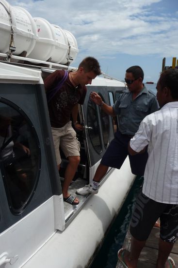 Heute, am 19.09.2010, verlassen wir Bali und reisen nach Lombok weiter. Um 9 Uhr sollen wir mit dem Speedbootunternehmen "Gili Cat" nach Lombok gebracht werden. Da es schon heute früh geregnet hat, verzögerte sich die Abfahrt, so dass wir erst um 10 Uhr gestartet sind.