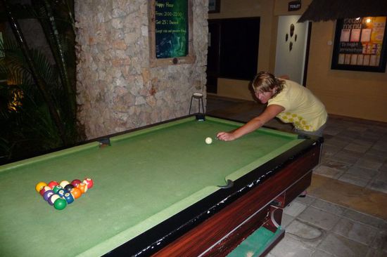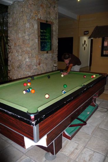 Als uns klar wurde, dass es heute nicht mehr aufhört zu regnen, haben wir beschlossen uns die Anlage mal näher anzusehen und unseren Gutschein für den Willkommensdrink einzulösen. Wir entschieden uns auch kurzfristig dagegen nochmal mit dem Taxi in die Stadt zu fahren. Großen Hunger hatten wir sowieso nicht und mehr wie uns dort in das nächst beste Restaurant zu setzen hätten wir auch nicht gemacht. Also sind wir in einem der drei Hotelrestaurants Essen gegangen und haben den Abend dann mit einer Partie Billard (2:1 für mich ) ausklingen lassen.