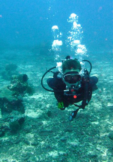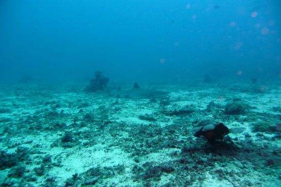 Und ganz unerwartet trafen wir auch bei dem zweiten Tauchgang wieder auf einen Hai. Erstmal lag er nur auf dem Boden, aber als Peter sich dann etwas genähert hat, schwomm er um uns (bzw. Peter) herum. Ich bin dann lieber immer weiter zurückgeschwommen