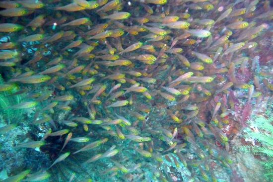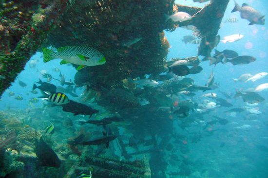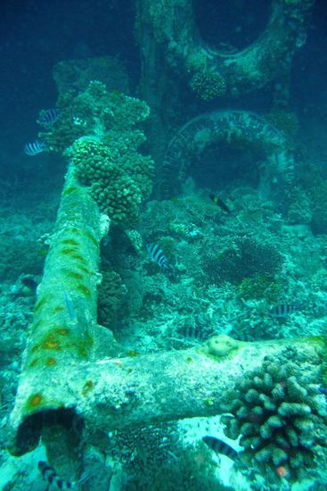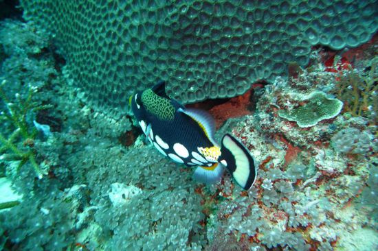 Wir sind mit ca. 30 weiteren Tauchern zum Tauchplatz "Bounty" raus gefahren, wo es eine Plattform zu erkunden gab. Der Tauchgang war nicht wirklich schön, da es unter Wasser so voll war, dass man aufpassen musste, wem man hinterher schwimmt. Ich verstehe auch nicht, warum 3 Boote der DreamDivers zu einem Tauchspot fahren, anstatt sich auf die anderen Plätze zu verteilen?!