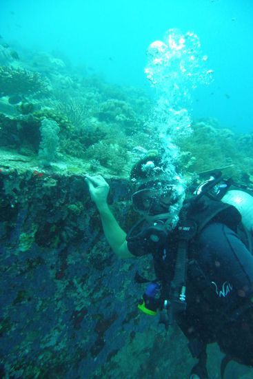 Man beachte den "Ausschlag" auf seinem Arm. Das passiert, wenn man unter Wasser nicht vorsichtig ist und eine Feuerkoralle streift