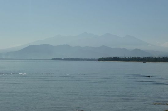 Da wir heute schon um 9 Uhr in der Tauchbasis sein mussten, sind wir früh aufgestanden, haben gefrühstückt (hab ich eigentlich schon erwähnt, dass uns die Pfannkuchen und Eier schon aus den Ohren kommen? ) und sind um 8.30 Uhr losgegangen. So früh sind noch kaum Wolken über Lombok, so dass wir endlich mal den Vulkan sehen konnten.