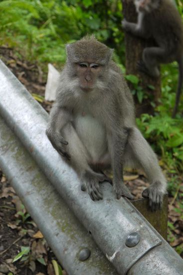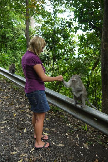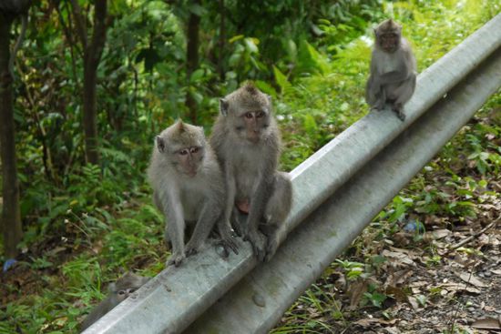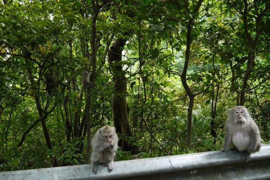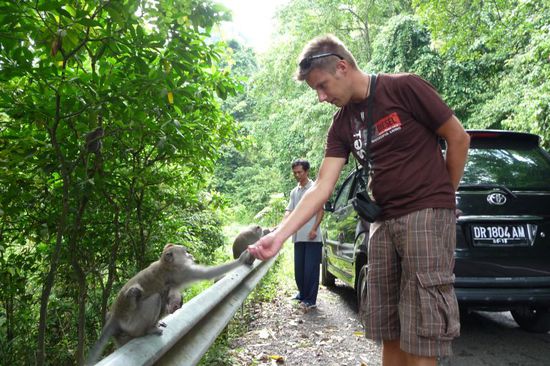 Danach sind wir den Pusuk-Pass entlang gefahren, wo man jede Menge Affen am Straßenrand findet. Da es etwas angefangen hatte zu regnen, wollten sich zuerst keine Affen zeigen. Aber ein paar Meter weiter hatten wir doch Glück und konnten die recht "zahmen" Affen füttern.