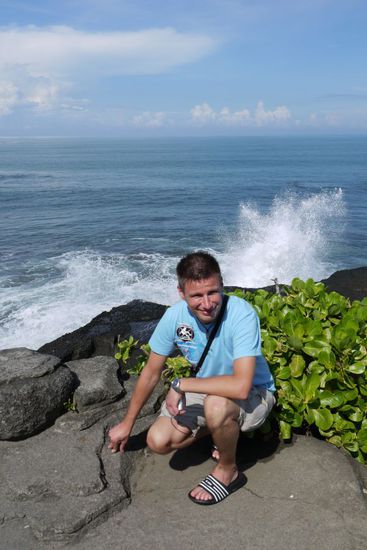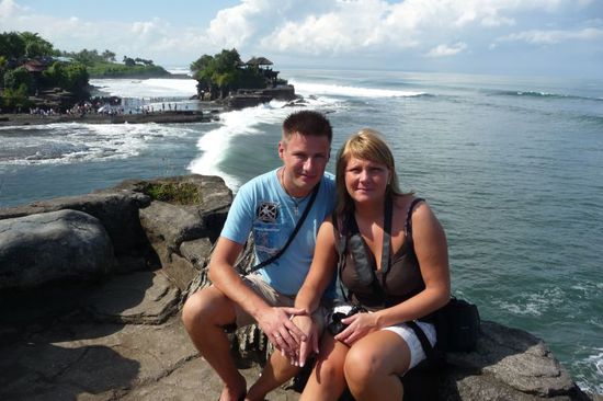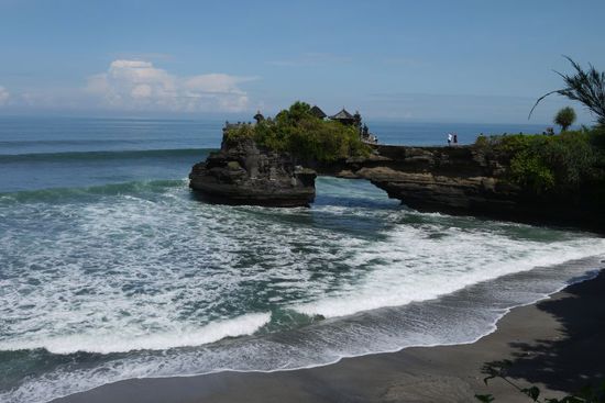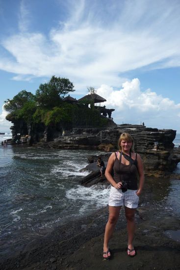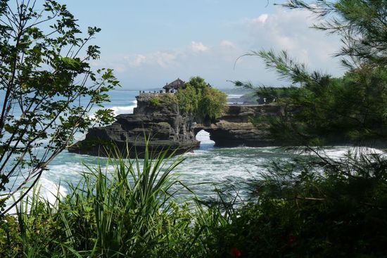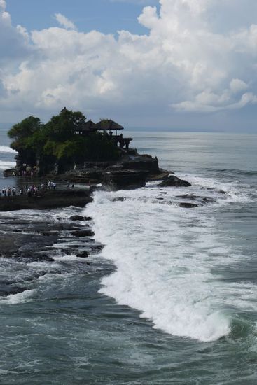 Unser erstes Ziel ist der Tempel Tanah Lot (= Land inmitten des Meeres), der wohl die schönste Kulisse zum Sonnenuntergang bietet. Wäre bestimmt schön gewesen, aber dann hätte irgendjemand all die anderen Touristen weglocken müssen, damit ich ein Bild nur vom Tempel hätte machen können und nicht von den Menschenmassen, die jetzt am frühen Morgen schon sehr aufgefallen sind. (Immer diese Touristen )