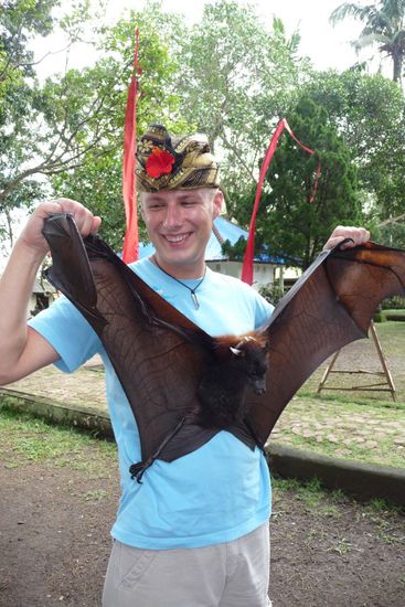 Unser nächstes Ziel führte uns nach Sangeh zum Affenwald. Vorab jedoch, war es möglich sich die Flughunde anzusehen und gegen ein kleines Trinkgeld (1? pro Person) durfte man sogar einen Flughund in den Arm nehmen.