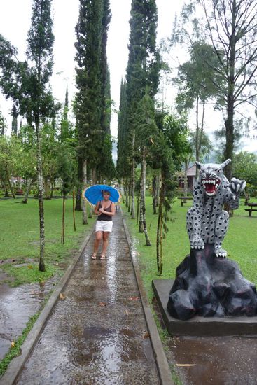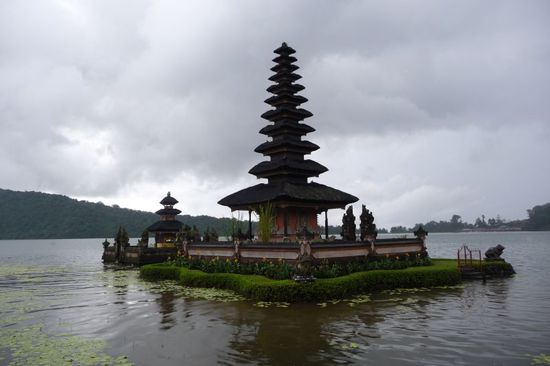 Der letzte Tempel für heute sollte dann der Pura Ulun Danu Bratan beim Bratan-See sein. Auch hier hatten wir richtig Pech mit dem Wetter, denn es wollte immer noch nicht aufhören zu regnen. So blieb uns nichts anderes übrig, als mit Regenschirmen bewaffnet den Tempel anzuschauen.