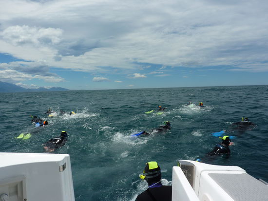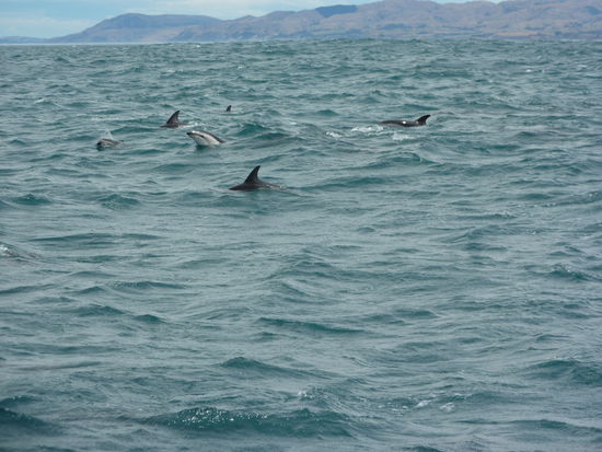 Nach einer kurzen Einleitung, wie man sich im Wasser zu verhalten hat, (Delfine nicht angreifen, bei Wadenkraempfe die Hand in die Hoehe und Faust machen) bekamen wir Tauchanzug, Schnorchel und Flossen verpasst. Eine gute halbe Stunde fuhren wir weit ins Meer hinaus, bis es hiess: "Leute ins Wasser, Delfine da!". Die See war sehr unruhig, bevor ich darueber nachdenken konnte, sitzend am Rande des Bootes, wie kalt und nass das Wasser ist, ob ich mich trauen soll, wurde ich durch eine grosse Welle ins Meer gestupst. Da waren sie nun meine Delfine!