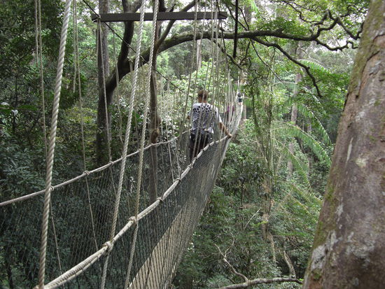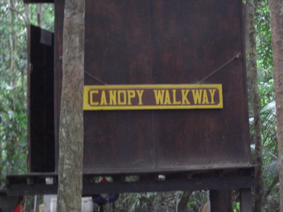 Der Canopy Walk ist mit gesamt 536m die laengste Haengebruecke der Welt (glaube ich zumindest), im moment sind davon aber nur 300m geoeffnet, da die anderen Haengebruecken renoviert werden. Hoehe der Haengebruecken liegt zwischen 20 und 45 meter (waere genau das Richtige fuer dich gewesen liebe Irene!! ). Bevor wir auf die Haengebruecken sind, hat unser Guide uns aber erstmal durch den Dschungel "getrieben". Wahnsinn! Was fuer ne Hoellentour sag ich euch! Ich hab geschwitzt, wie noch nie zuvor in meinem Leben (ausser vielleicht in der Sauna, in der ich nackig sitze und raus gehen kann wenn's mir zu doof wird. Hier aber habe ich lange Hosen an, ueber die ich mir aus Angst vor Blutegel die Socken drueber gezogen habe und noch dazu habe ich ein langaermiges T-Shirt an!! Geht mal so in die Sauna, bleibt 2 Stunden sitzen, dann wisst ihr, wie es sich im Taman Negara-Regenwald anfuehlt!!! )