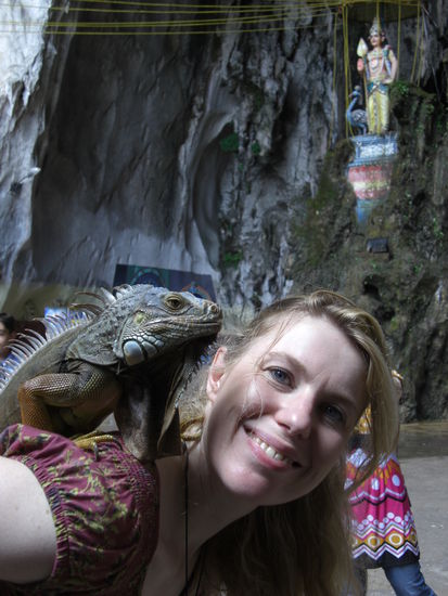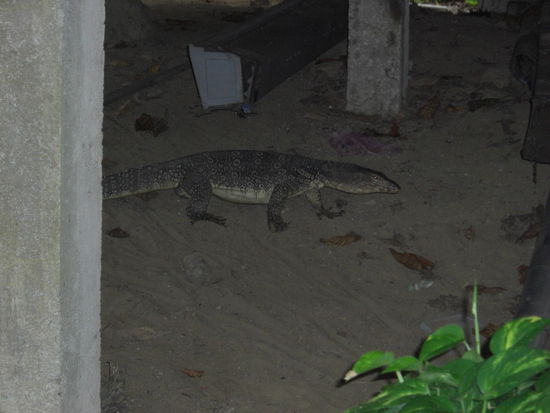 Danach ist mir dann Christine wieder uebern Weg gelaufen, die hier ihren Tauchschein macht und ihre Tauchgaenge da gerade fix gemacht hat und dann sind wir erstmal was essen gegangen. Also das essen ist okay (mehr aber auch nicht), die Preise deutlich hoeher als in Kuala Lumpur (und zwar bei allem! Zahle hier fuers Internet die Stunde 20,- MYR, in KL waren es 8,- !!) und Freundlich ist echt was anderes! Die Leute die in den Restaurants arbeiten machen alle den Eindruck, als wuerde sie jemand dazu zwingen. Ganz selten kriegst du hier mal ein laecheln.....nicht gerade so toll! Daran muessen sie echt noch arbeiten, aber haben sie wahrscheinlich nicht noetig. Aber der Strand und die Natur entschaedigt einen dafuer! Ueberall Hibiskusbaeume (uebrigens die Nationalpflanze Malaysias) in allen Farben. Und wahnsinnige Tiere. Der Kamerad hier ist mir vorhin vor die Linse gelaufen, als ich vom Strand zurueck kam. Er lag unter unserem Langhaus: