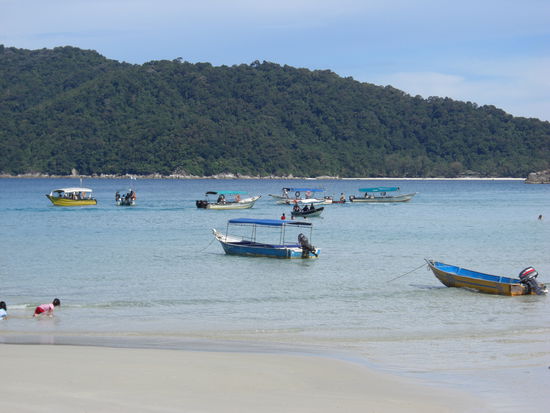Also die Unterkunft war nun gefunden, dann hab ich mich erstmal umgezogen und mir ein schoenes Plaetzchen am Strand gesucht. Sonnenschirm kostet hier inkl. ner Strohmatte 10,- MYR, was echt verdammt viel ist (wenn man bedenkt, dass man dafuer auch ein Abendessen bekommt). Liegestuehle: Fehlanzeige!! Natuerlich bin ich alte Wasserratte dann sofort ins Wasser gesprungen und Leute: das ist der HAMMER!!! Glasklar und noch nie in meinem Leben war ich in einem so warmen Meer! Das ist nun WIRKLICH eine Badewanne. Es gibt Stellen, da ist es warm wie in einer Therme! Wahnsinn, wirklich! Bin hin und weg von diesem Meer! Wenn es nach mir ginge, waere ich da auch nie wieder rausgekommen , aber leider ist die Sonne hier so heftig, dass ich wirklich aufpassen muss, mir nicht den Uebelsten Sonnenbrand zu holen! Schmier mich ja eh schon mit Lichtschutzfaktor 50 (!!) ein, aber paar rote Stellen hab ich trotzdem schon! Es ist verdammt heiss hier - um die 35 Grad. Alles sehr ueberschaubar und einfach, aber schoen! Ein kleines Paradies ist das hier!! Leider scheinen die Einwohner das nicht so richtig zu schaetzen zu wissen, denn zwischen den Huetten liegt schon ganz schoen viel Muell rum ueberall und die Botte stinken uebelst nach Benzin, was auch alles im Meer landet....aber das sind halt die ueblichen Probleme in diesen Laendern. Umweltbewusstsein ist da echt Fehlanzeige - LEIDER!!