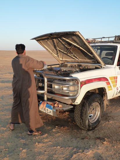 Es wird schon recht dämmrig, als wir die weiße Wüste erreichen, da unterwegs das Kühlwasser kocht. Aber das regt einen rallyefahrenden Reeda natürlich nicht auf. Der Kühler hat oben an der Verlötung ein kleines Loch, Wasser haben wir ja reichlich mit und - wie es sich gehört - bei laufendem Motor wird gehörig Wasser nachgefüllt.