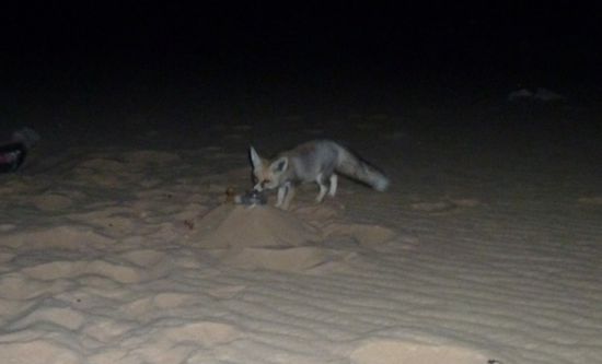 Ulrike hat derweil Probleme mit dem Bohneneintopf von heute mittag (oder waren es die Datteln?) und muß viermal - zu Abendessen will sie auch nicht. Reeda kocht für uns beide Hühnchen mit Nudeln - so komme ich dann letzten Endes doch noch ans Knochennagen. Für die Reste interessiert sich ein ganz vorsichtig um uns rum schleichender Wüstenfuchs.