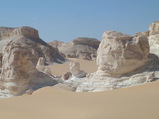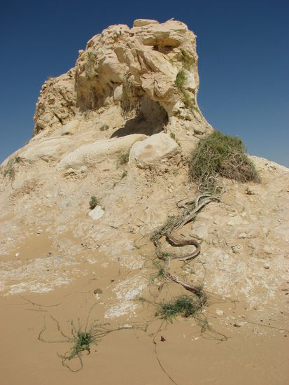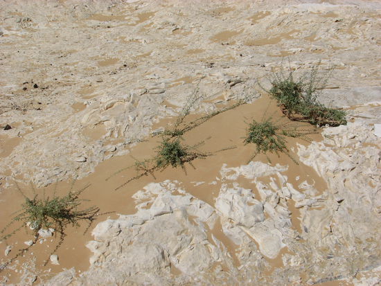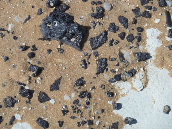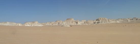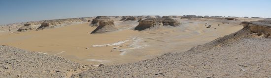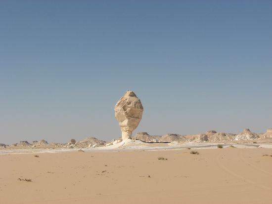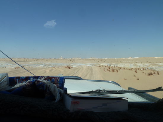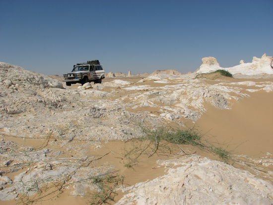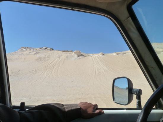 Danach überquert Reeda die Hauptstrasse (Bahariya-Farafra) und hält als nächstes in der Crystal Desert. Er hat vorne im Wagen ein paar schwarze Kristallformationen liegen, die wohl von hier stammen. Direkt geht Ulrike auf Suche, wir finden zwar welche, aber so schöne wie im Wagen schaffen wir nicht.