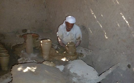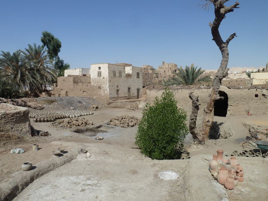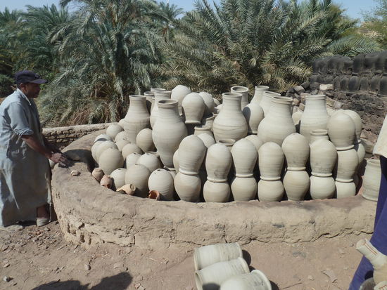 Wir löhnen Führer mit 50 LE und dann habe ich kein Kleingeld fürs Museum (10LE) . Das bezahlt dann Reedo, der Ulrike schließlich auch von seinen Zitronen abgibt, und sie nicht zu einem Laden führt. Auf dem Rundweg durch den Ort geht es dann zur Pottery, wo die speziellen Wasserbehälter von el Quasr gemacht werden.