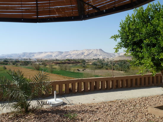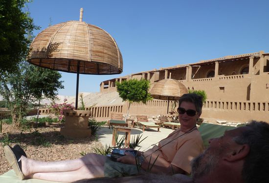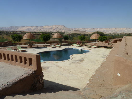 Auf der Terrasse trinken wir einen Tee und beschließen einen beschaulichen Abschlußnachmittag zu machen. Die Eigentümerin, die sich schon heute morgen von uns verabschiedte hat, sitzt immer noch rum und bescheidet uns, dass die Benzinpumpe der Tankstelle kaputt ist und sie keinen Sprit bekommt. Dabei muß sie noch viel mit ihrem Manager in Farafra besprechen. Sie empfiehlt uns den windigen schattigen Platz am Pool, den wir danach einnehmen.