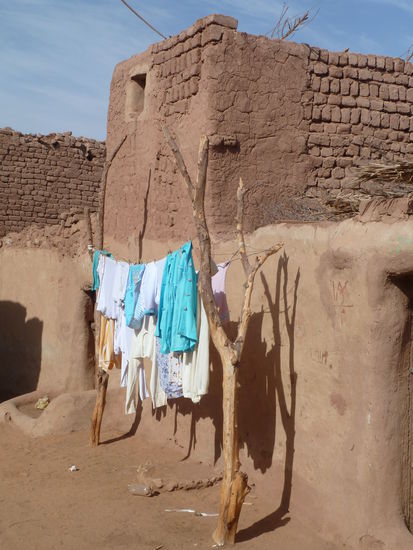 Eine Frau steht in einer Gasse und hält große Wäsche, er spricht sie an, und nach einigen Verhandlungen dürfen wir das Haus besichtigen.