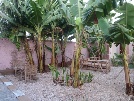 Aber ins Tal kann man kaum sehen. Und als man es kann, sieht man nur Rauch und Dunst. Außerdem wird die Strasse hundmiserabel, und die langsame Fahrt entlang eines Nilseitenkanals mit unvorstellbarem Dreck läßt uns der sauberen Luft in der Wüste und den Oasen nachtrauern. Es geht bereits deutlich auf 17.00 Uhr zu, als wir nun endlich abbiegen und über einen abstrusen Weg zum Al Baeirat Hotel fahren. Dort angekommen, sieht alles zunächst etwas abenteuerlich aus. Offenes Restaurant, Hof mit Lehmboden, an dem das Office, ein Bazaar und die Toiletten sind. Doch etwas weiter hinten öffnet sich ein Bananengarten mit vier Doppelhäusern. Wir bekommen Bungalow 107. Schnell werden noch ein paar Fotos gemacht, bevor es dunkel wird; man warnt uns vor den Mücken! Dabei haben sie mich doch gestern schon so gepisackt am Swimmingpool.
