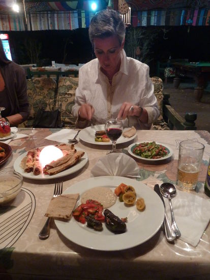 Um 19.30 gibt es dann ein vorzügliches Gästemahl für alle, die hier übernachten (Erinnerungen an Namibia werden wach). Es entwickelt sich ein sehr nettes Gespräch und da wir völlig des Alkohols entwöhnt sind, steigt die 2. Flasche Bier - eins hatten wir schon auf dem Zimmer - zu Kopf. Ulrike meldet mit ihren 2 Gläsern Rotwein nichts dergleichen. Das Essen ist sehr gut, man erzählt uns, dass manchmal hier sogar ein Kochklurs angeboten wird. Ein Teller wird serviert, auf dem in der Mitte