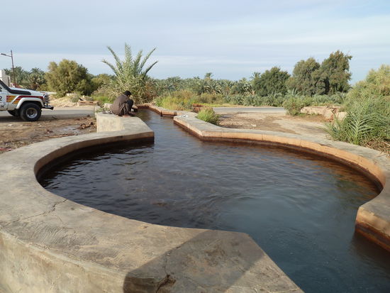 Wir starten am Old Oasis Hotel und machen den ersten Stop an der Senke zu den Palmengärten an einem weiteren der zahlreichen Brunnen mit heißem Wasser, meist zu heiß zum baden (wobei man den örtlichen Sitten und Gebräuchen schon Beachtung schenken sollte - vor allem weibliche Touristen)