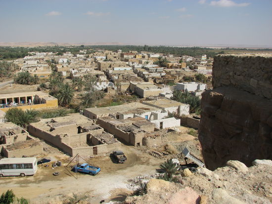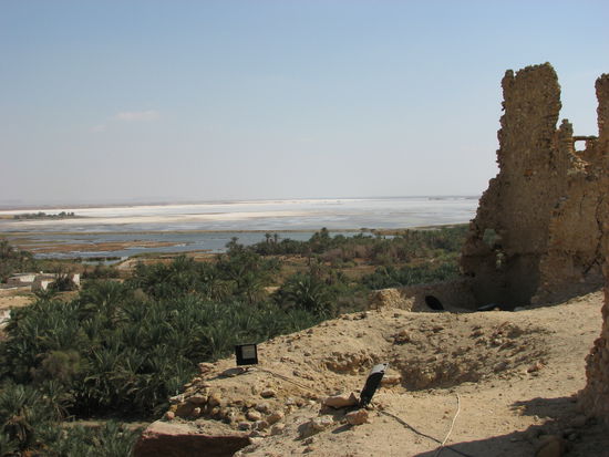 Inmitten der Ruinen von Aghurmi bieten sich umwerfende Blicke über die Palmengipfel der Oase, die neue Ortschaft Aghurmi, und den Salzsee.