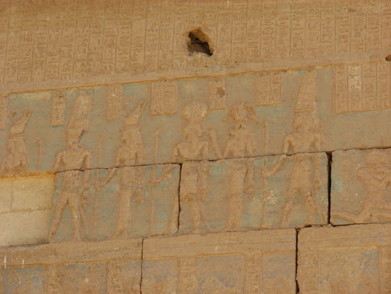 Ein netter Führer macht uns auf einen Brunnen aufmerksam, der recht tief ist aber sicher früher noch tiefer war. Er zeigt uns auch die kaum sichtbaren Abbildungen in den Wänden des Tempels.