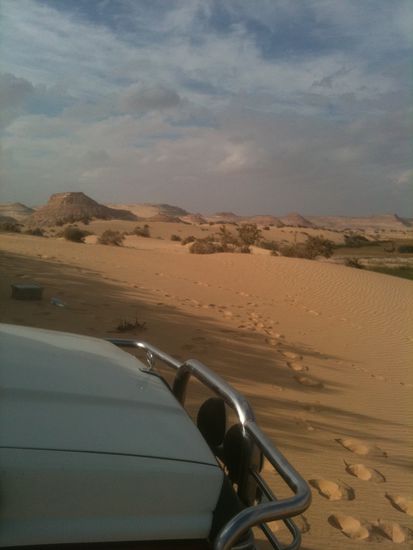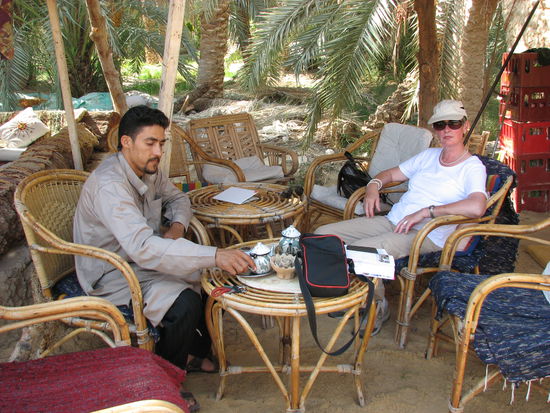 Dann starten wir zur Oase Baheidati, wo wir mit Blick auf die große Sandwüste im Fließsand den nächsten Tee bekommen.