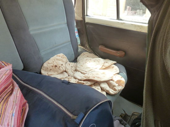Gegen 14.00 Uhr fahren wir dann zum Einkaufen in die Stadt zurück. Reeda hat so seine Spezies, Zwiebeln hier, dann totes Huhn da und zuletzt frisches Brot noch woanders, das noch warm zunächst auf dem Rücksitz auskühlen muß, bevor es später in die Tüte kommt.