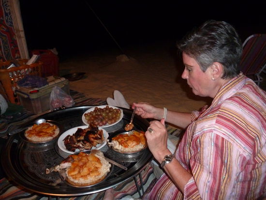 werden gestellt - wir haben unsere eigenen Mikrofaserschlafsäcke und aufblasbare Kopfkissen dabei. Ulrike findet aber den Einstieg nicht! Außerdem findet sie den Sand trotz der Schlafmatten äußerst hart und buckelig. Noch ist es recht warm im Zelt, aber es kommt ein starkes Wind auf.