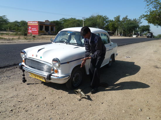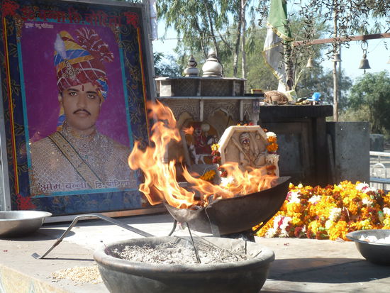 Einen kurzen Stop machen wir an einer Stelle - ich taufe sie den Motorradtempel - den manche Hindu verehren, da der Sohn des Maharadjas dort mit dem Motorrad tödlich verunglückte und die Mähr geht, dass das Motorrad nachts alleine fährt und morgens wieder da steht.