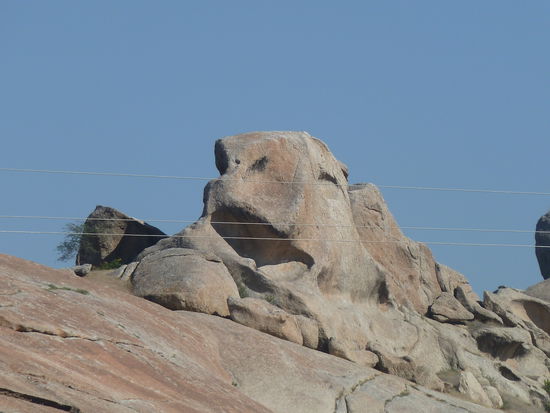 Über die einspurige Strasse geht es dann allmählich in bergige Landschaft. Einige interessante Steinformationen laden zu einem Stop ein, damit man an ihnen die Fantasie spielen lassen kann.