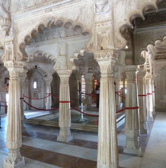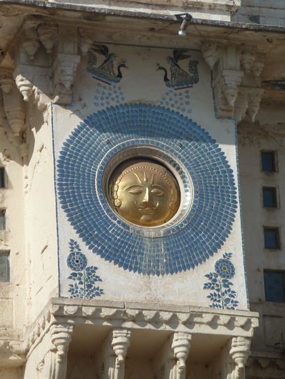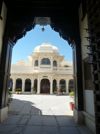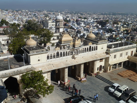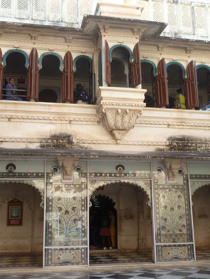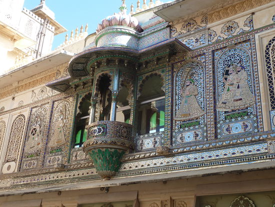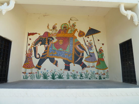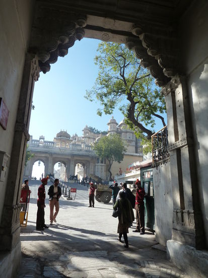 Wir laufen 100 m weiter die Straße hoch und erreichen den Eingang zum City Palace. Diesmal haben sie es mit den Eintrittspreisen wieder anders gemacht. pP 50 Rs + 200 Kamera. Der Andrang ist groß und die Sicherheitskontrolle lasch. Wir folgen den Schildern für die Audiotour - aber ohne Audio - und sind nach 2 Stunden durch. Insgesamt mehr Wandmalereien und weniger Architektur als bisher.