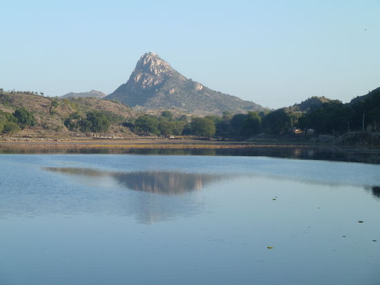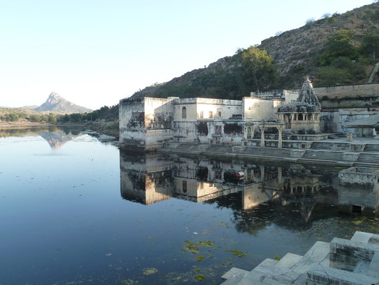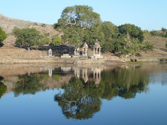 Nur wenige Kilometer weiter in Eklingli - GPS 24° 44' 52,34" / 73° 43' 25,5" - ist ein zweiter weit dreckigerer See mit einer weniger eindrucksvollen Tempelanlage, an dem eine riesige Ziegenherde vorbeizieht. Trotzdem genießen wir die schöne Landschaft, da wir wieder auf 2000 ft sind.