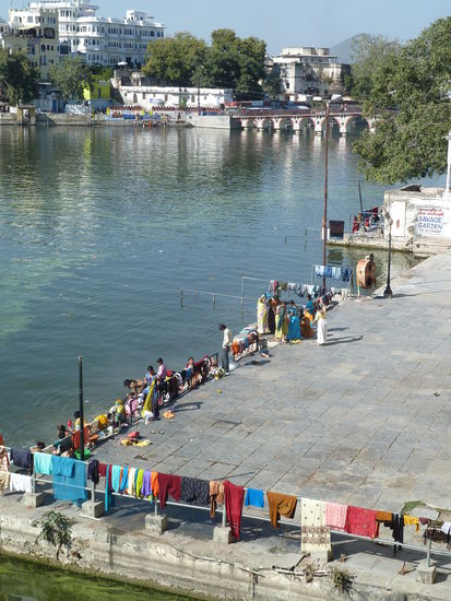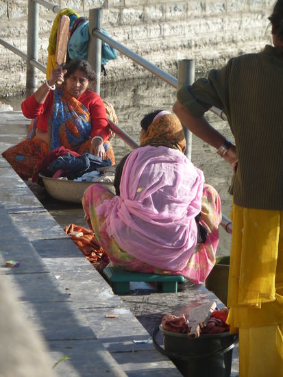 an der Fußgängerbrücke herrscht schon hektische Betriebsamkeit mit großer Wäsche - in nicht einladendem Wasser