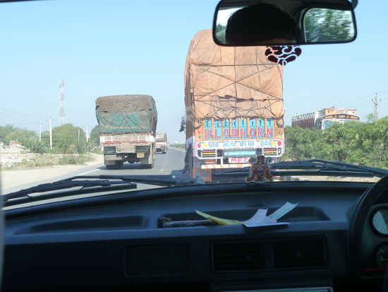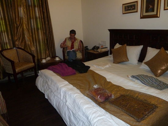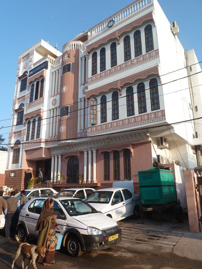 Randher fragtuns, ob wir einen Textilladen mit hochwertigen Sachen sehen wollen: wir wollen, aber der Verkäufer ist uns unsympathisch undnachdem Ulrike keinen Großeinkauf tätigt, verliert dieser auch sofort sein Interesse an uns. Durch den immensen Großstadtverkehr erreichen wir dann unser Raiputana Haveli, das von außen sehr nett aussieht und auch schöne Zimmer hat.