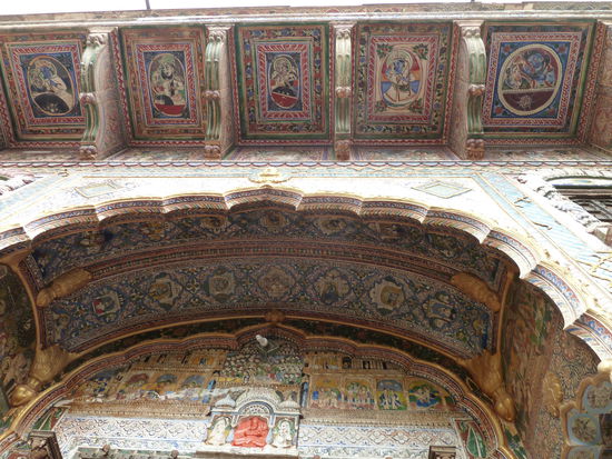 Wir finden durch den 'Pratsch' der weitgehend unbefestigten Straßen ein paar sehr schöne Havelis, an denen der Zahn der Zeit zwar äußerlich nagt, aber trotzdem die einstige Pracht erkennen lassen. Meine Panasonic hatte schon in Dundlod den Geist (Batterie) aufgegeben, so dass ich nun mit der dicken Canon weitermache.