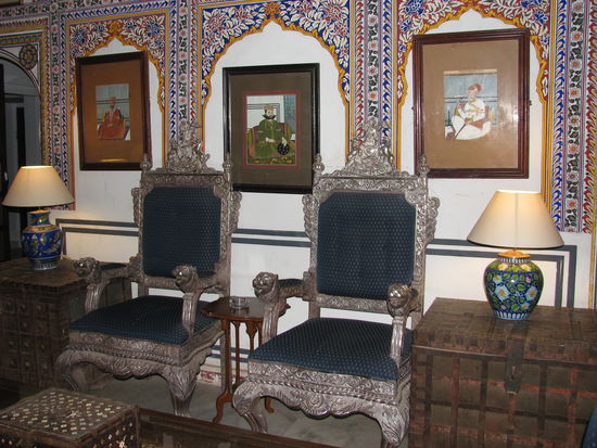 Das zum Hotel umgebaute Fort 'Castle Mandawa' ist ein riesiger Komplex. Zahlreiche Kamele verlassen gerade den Innenhof und allmählich tanzen auch Mücken über meinem Kopf. Wir verziehen uns ins Innere des Castle und finden hinter der Rezeption einen tollen zweistöckigen Raum mit silberbeschlagenen Sesseln.