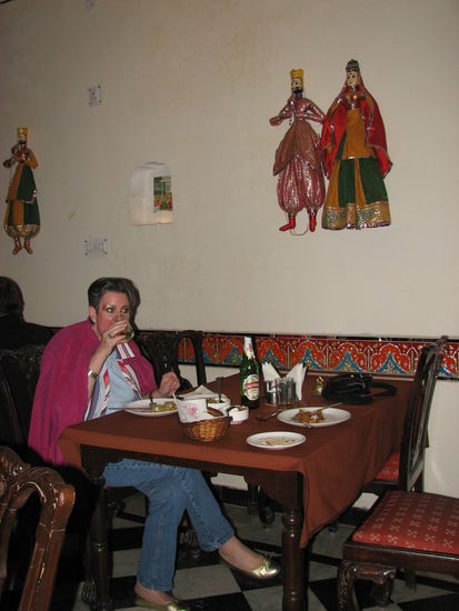 Mir ist kalt, aber Ulrike möchte gern noch ein Bier, daher gibt es Bier, aber Gott sei Dank ist dieses nicht so kalt wie vorher. Ulrike ißt Huhn und Reis, ich wähle Gemüse mit indischen Gewürzen und Knoblauch-Naan. Beides ist lecker, diesmal muß Ulrike Knöchelchen knabbern.