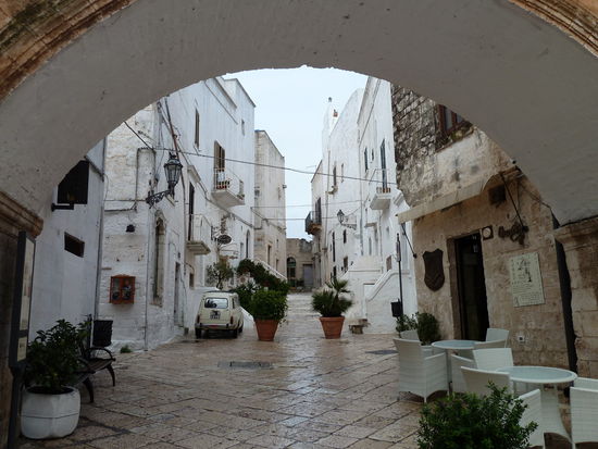 Nachdem es gestern an unserem 1. Tag in Apulien wolkenbruchartige Regenfälle gab, die den Trockenmauern in unserer ländlichen Olivenhaingegend arg zugesetzt hatten, sieht es heute morgen nicht mehr ganz so trübe aus, denn zwischen den dunklen Wolken ist auch mal etwas blauer Himmel zu sehen. Nach dem Frühstück melden wir unserem Vermieter den undichten Trullo - es tropfte gestern aus dem Gewölbe; der ist entsetzt, da er im Sommer für viel Geld, das ganze Dach hat abdichten lassen. Danach fahren wir nach Ostuni und beginnen die gestern ausgefallene Besichtigung.