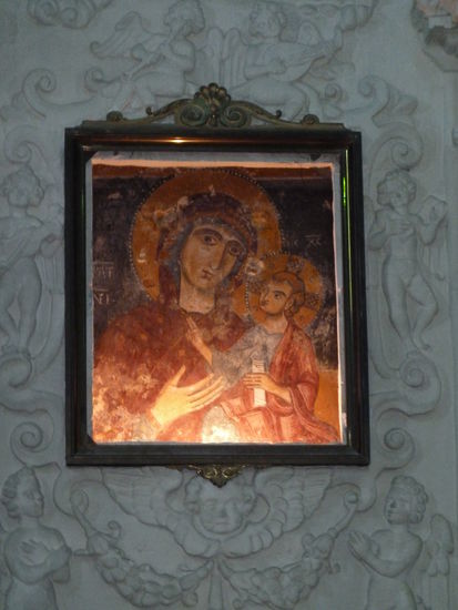 Große Pilaster bestimmen das Innere, an der Decke sieht man konzentrische Kreise als Symbol von Kuppeln und die Reste einer Ikonostase.