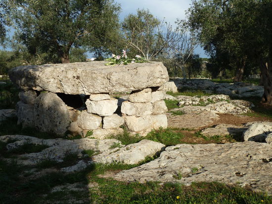 Dolmen stehen in der Geschichte der Grabriten für den Übergang von der Höhlenbestattung zu einer angelegten Grabstätte. Normalerweise durch Erdhügel bedeckt, kann man sie heute - wenn sie denn entdeckt worden sind - von der Erde befreit als 'Steinplattenkonstruktion' sehen. Die Toten wurde in Kauerstellung begraben.