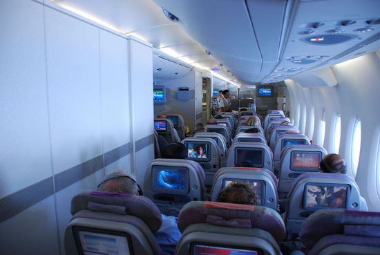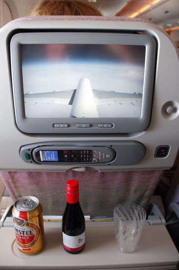 Jetzt sitze ich in dem Riesenvogel und es ist kein anderes Gefühl als in einem anderen Widebody. Nur ist der neue Airbus viel leichter als alle anderen Flieger. Sitzabstand 81cm, Sitzbreite 47cm. Speziell die Sitzbreite ist im Vergleich zur Boeing um ca. 10% gestiegen. Auch fehlt die oft störende Entertainment-Box unter dem Vordersitz. Ein echter Komfortgewinn. Fußstützen fehlen dagegen.