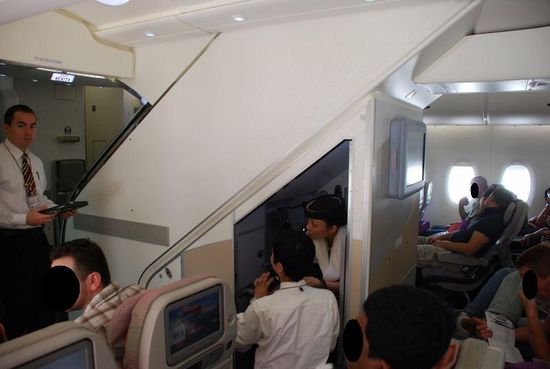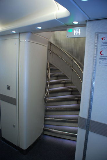 Treppe zum Oberdeck, wo sich die First- und Business-Class befindet. Da durfte ich erst auf dem Rückflug rauf...