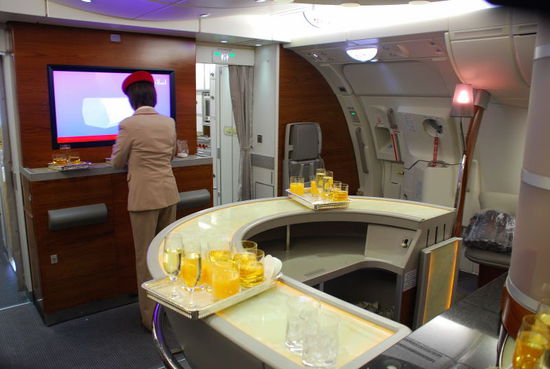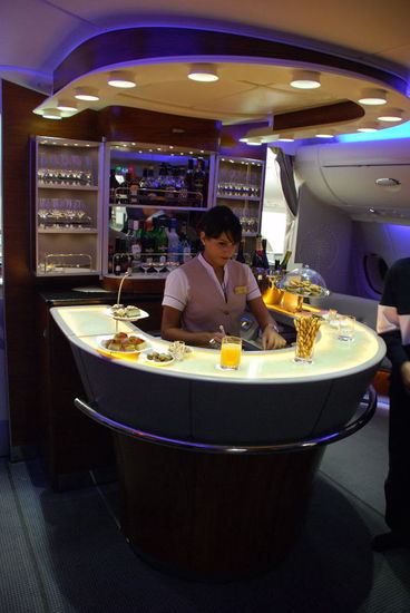 Im hinteren Teil des Oberdecks befindet sich die Bar für die First- und Business-Class. Bei diesem Nachtflug war sie meist verweist. Da man in der Business eh viel Platz an seinem Sitz hat, braucht man die Bar eigentlich nicht. Hat dennoch Spaß gemacht ein paar Drinks zu sich zu nehmen.