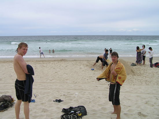Heute wollten wir endlich mal wieder etwas neues sehen hier in Brisbane. Also hatten wir uns vorgenommen zur nicht allzu weit entfernten "Gold Coast" zu fahren, denn diese wurde in vielen Reiseführern als Badeort empfohlen. Da T-jay heute frei hatte konnte er uns begleiten. Nach 1h Zugfahrt und weiteren 30 Minuten Busfahrt waren wir endlich da. Das sogenannte Surfers Paradies entpuppte sich jedoch an diesem Tag als sonnenloses Paradies. Ausgerechnet heute hatten wir mal keinen blauen Himmel sondern Wolken. Aber nichts desto trotz ließen wir uns die Chance nicht nehmen heute zum ersten Mal im Pazifik zu baden. Lange hielten wir es jedoch nicht im Wasser aus, weil die Kombination aus starkem Wind und noch recht kaltem Pazifik Wasser uns schnell zu schaffen machte.