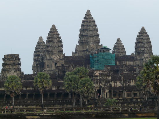 Aber der Reihe nach. Nach einem tollen Fruehstueck in unserem noch tolleren Hotel. (Ich erwaehnte es glaube ich schon) stand Kon unser Tuk-Tuk Pilot fuer die naechsten 3 Tage auf der Matte. Und los gings. Es gibt nichts, das den Besucher auf die majestaetische Erhabenheit von Angkor Wat vorbereiten koennte. Die fuenf grandiosen maiskolbenfoermigen Tuerme halten den Blick gefangen, waehrend man sich in Gedanken vor der Vorstellungskraft der Baumeister verneigt( Danke Stefan Loose) Es ist schlichtweg umwerfend. Und genau das passiert einem auch, wenn man die Augen statt auf dem Weg zu haben, faziniert auf die Anlagen glotzt.