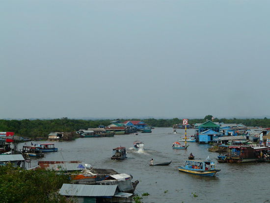 Die Boote fahren wie an einer Perlenkette aufgereiht durch das zur Zeit noch bestehende Ueberschwemmungsgebiet, bis zur Einmuendung in den tatsaechlichen See. Zuvor aben wir das sogenannte Floating Village passiert, in den arme viatnamesische illegale Minderheiten leben, vielleicht auch hausen. Zum Teil wirklich gruselig. Und der Bootspilot ist auch extra langsam durchgefahren, damit man sie besser fotografieren konnte. Man fuehlte sich ein bisschen so wie beim Zoobesuch. Da wars dann mal Zeit sich ein klein wenig zu schaemen. Am eigentlichen See angekommen stoppten die Boote, machten die Motoren aus und von ueberall her kamen kleine Motorboote, bevorzugt mit Frauen und kleinen Kindern drauf, die dann auch noch zu allem Ueberfluss Schlangen um den Hals hatten. So setzten sie sich dann fuer die Touris in Pose um fuer ein Foto 1$ zu kassieren. Erwaehnte ich schonmal das Wort surril in diesem Beitrag???