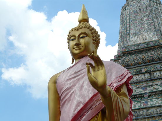 Den Tag haben wir bei noch gut aushaltbaren Temperaturen mit einem guten Fruehstueck auf unserer Terasse gestartet. Blick ueber den Fluss und herrlichem Lavazza Kaffe.Herz was willst du mehr? Nach zuegellosem Kaffeegenuss und dem Hinweis des Kellners: Madam, I think, you can't sleep tonight haben wir mit der Besichtigung von Wat Arun begonnen.( Ich glaube, der Kellner hatte Angst, das ich ihm den ganzen kaffe austrinke und das schon am Ersten Morgen).Daran haben wir gleich noch eine Klongfahrt gehaengt und uns in einem Longtail-Boot durch das alte Bangkok fahren lassen. Oh wie wunderbar. Und da wir noch nicht genug hatten, sind wir auch noch ausgiebig zu Fuss durch die Gassen von Tonburi geschlendert. Niemand auch wirklich niemand hat gefragt ob wir ein Tuk-Tuk brauchen, oder ein Taxi, ob wir mal in seinem Laden vorbei schauen wollen usw. usw. Ja, ja,so gehts auch.