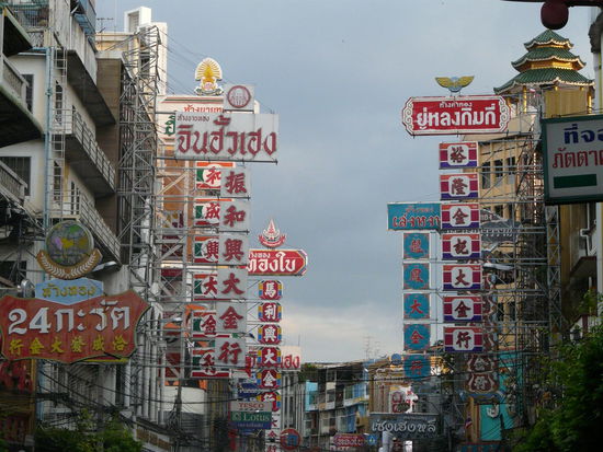 Nicht unerwaehnt bleiben sollte auch der Umstand, dass ich abenteuerlustig, wie ich nun mal bin, frohgemut meine VISA-Karte in den Schlitz einer Hoellenmaschine gesteckt habe und tatsaechlich Bares bekommen habe. Mal sehen, ob morgen auch diese Karte vorsorglich von meinem fuersorglichen Geldinstitut gesperrt wird. Nach dem Tempelflash sind wir zurueck ins Hotel gestiefelt, haben die gediegenen Klamotten abgeworfen und noch zwei kuehle Biere gezischt. Danach haben wir uns,immer frei nach dem Motto, Bangkok Stadt der Gegensaetze, nach Chinatown aufgemacht.