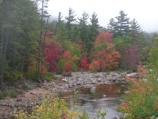 Es wurde auch das Wetter zunehmend schlechter. Die Wolken waren sehr tief, es war neblig und es nieselte ganz leicht, als wir den Kancamagus Highway erreichten. Die Laubfärbung war perfekt, genau der richtige Zeitpunkt, besser könnte es nicht sein, wenn.....ja wenn das Wetter ebenso perfekt gewesen wäre. War es aber nicht, der Regen wurde stärker und je weiter wir hoch fuhren umso tiefer kamen die Wolken Ich hätte heulen können, so schnell löst sich ein Traum vom Indian Summer in Regen, Nebel und Wolken auf!!