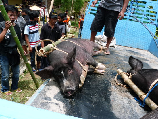 Als ich in Rantepao ankam, war so eine Zeremonie gerade im Gange. Ich wohnte at Pia's Poppies Hotel und Pia, die Besitzerin, war sehr hilfsreich. Da sie an diesem Tag an die Zeremonie ging, fragte sie, ob wir, also Petra (die Deutsche) und ich mitfahren wollten. Natürlich gingen wir mit. Somit stiegen wir hinten in einen offenen Truck, mit dabei, 5 Schweine!! Die taten mir so leid! Die Schweine konnten sich nicht bewegen, denn man hatte ihnen die Vorder- und Hinterbeine zusammengebunden und die Schweine lagen über einen Holzmast, so wurden sie dann getragen. Bei jeder Bewegung schrien sie. Aber ganz schrecklich wurde es dann erst an der Zeremonie. Überall lagen Schweine in der brühenden Hitze und warteten auf die "Hinrichtung". An diesem Tag wurden 300 Schweine getötet. Bevor es dann Mittagessen gab, war ich schon wieder weg, es war mir alles zu blutig und eigentlich hatte ich nach dieser Schlachterei keine Lust mehr Schwein zu essen. Somit ging's zurück nach Rantepao, wo ich dann denn Nachmittag ganz gemütlich mit lesen verbrachte.